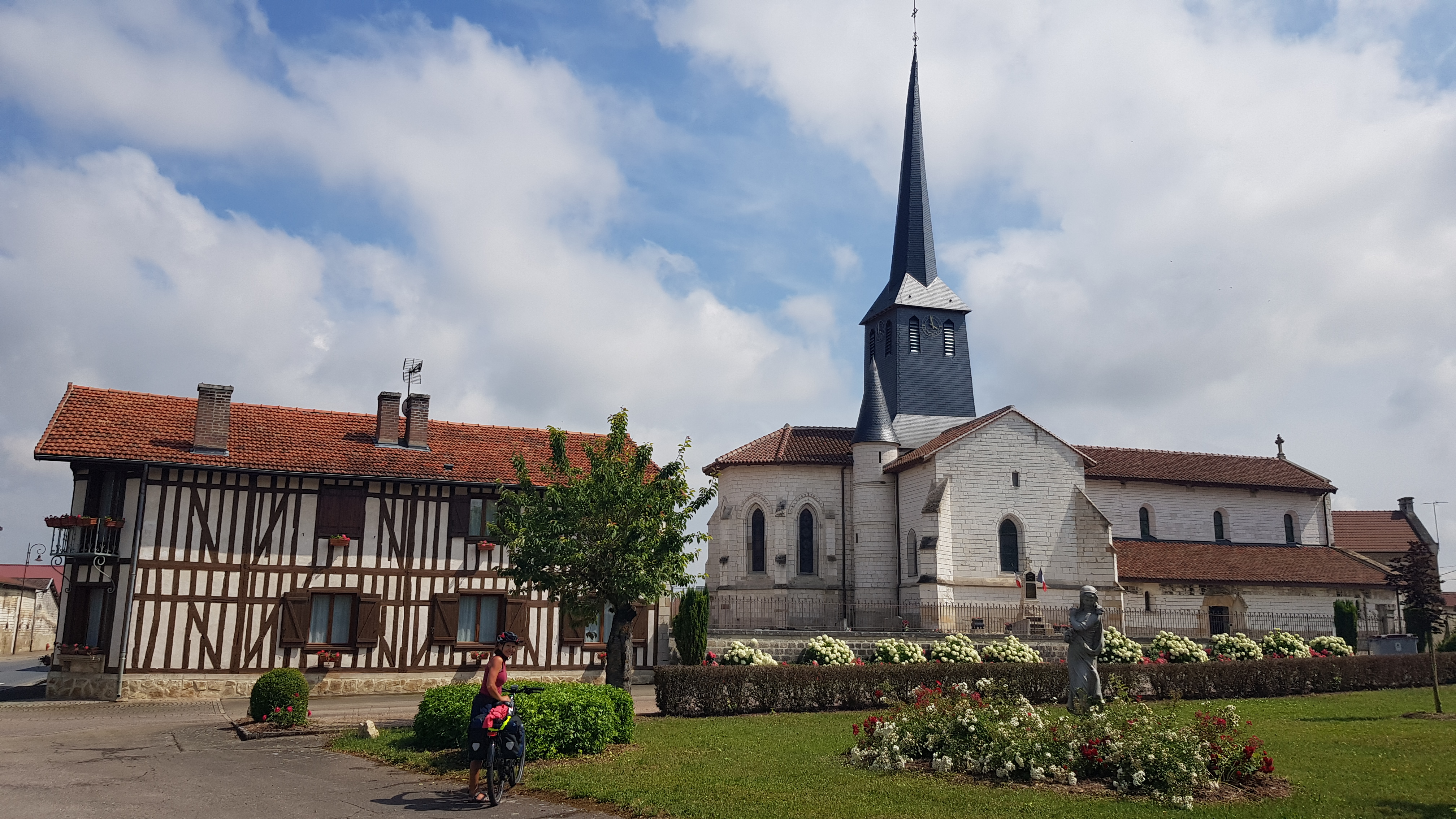 Leaving really early, still the same strong headwind. Shooting some pictures in Verdun Centre, and, Surprise! Discovering a nice bike-track along the river “la Meuse”. We enjoy the ride, later following the “voie verte”. This leads us into the countryside, “à la campagne”, not much except farmhouses and fields. Although it is quite lonesome, the landscape is nice: fields of sweet corn, sunflowers starting to grow. It smells of hay and grass. On the hills, at a long distance, we see old, massive churches, buildings that survived WWI. Up and down we ride, some hard ascents (thank you e-bike!), but pleasant on the whole. We are glad we reserved a hotel early morning; this is a popular area for bikers.